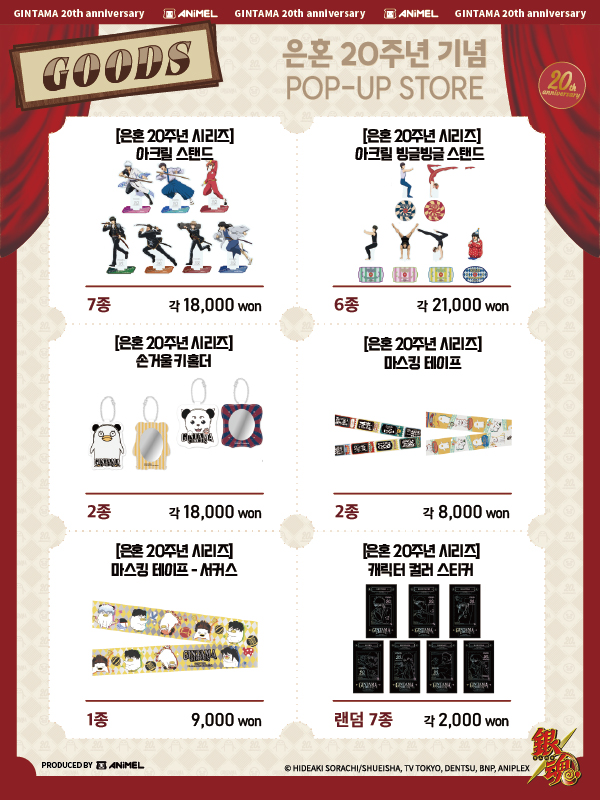 오늘 은혼 20주년 기념 팝업 스토어의 상품 리스트가 공개되었습니다! 캔 배지, 마그넷, 아크릴 보드, 아크릴 키홀더부터 아크릴 스탠드, 스티커 등 정말 많은 상품이 준비되어있다고 하니 1월 16일부터 놓치지 말고 만나보세요!